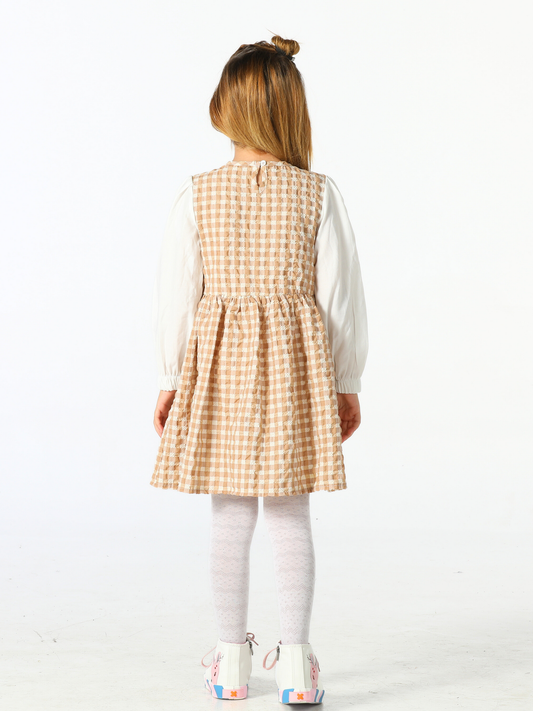 Beige Checkered Ruffle Dress with 3D Embroidery